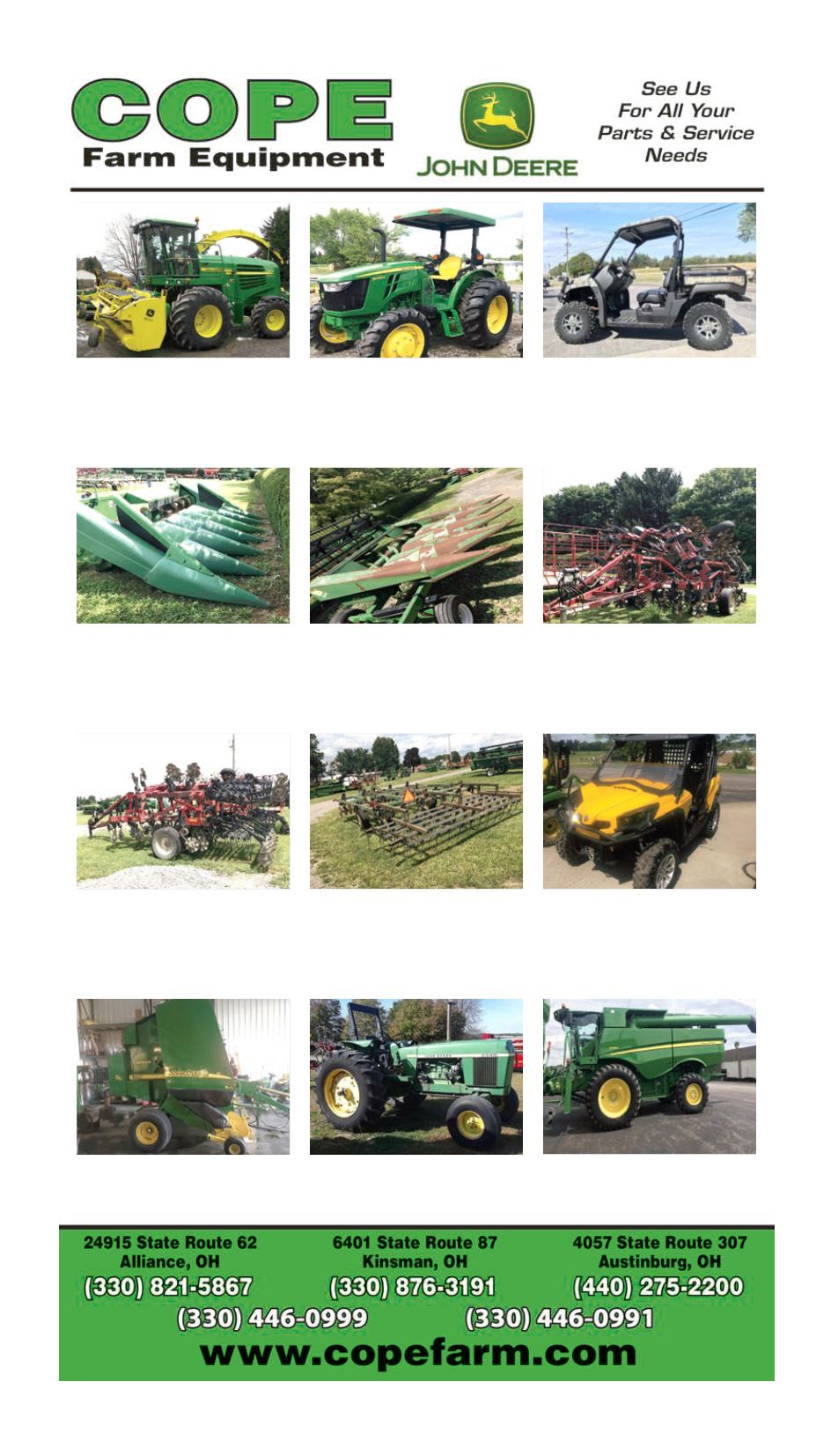 2011 JD 7450 chopper, 4WD, kernel processor, JD 640c hay head, JD 686 6 row corn head, 1227 eng.hrs., 869 cutter head hrs.................$240,000 693 cornhead.....................$15,000 New Salford RTS, i2100, has been rented. 16 ft .......................$33,900 2004 John Deere 582 Round Baler Silage.................................$20,000 John Deere 5045E, 4WD, 350 hours, 45hp ..................................$19,500 John Deere 444 Cornhead ....$1,800 John Deere 724 finisher, 12’9” ........ ........................................................ $7,500 John Deere 2840 80HP wide front... .............................................$7,500 2013 550 gator 214 hrs ........$7,950 New Salford RTS, i2100, has been rented. 20 ft .......................$43,900 2012 Can-Am Commander xt, 207 hours, 4 wd, dump bed ........$8,900 2014 John Deere S660 4wd, duals, straw chopper, 1680 engine hours, 1107 sep hours.................$205,000